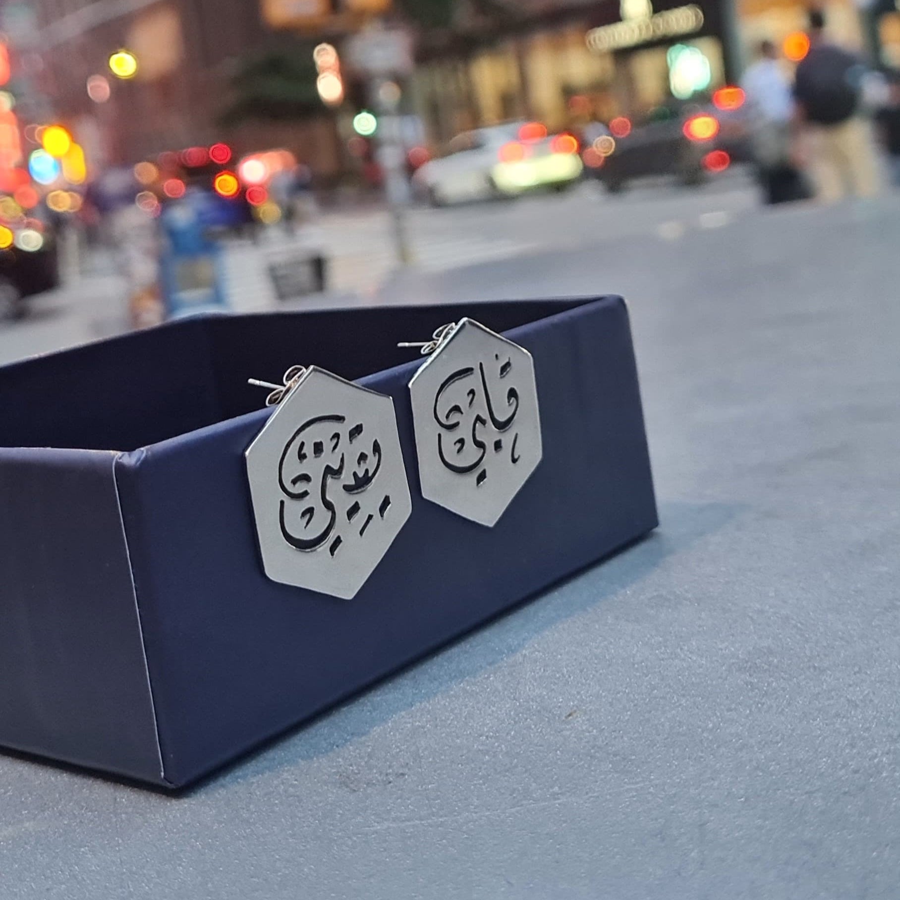 The Yaqīn Earrings are a bold celebration of personal strength and poetic expression. Designed in a striking hexagonal shape, these earrings are engraved with the evocative Arabic words: قلبي يقيني — "My heart is my certainty", penned by renowned Lebanese poet Zahi Wehbi.